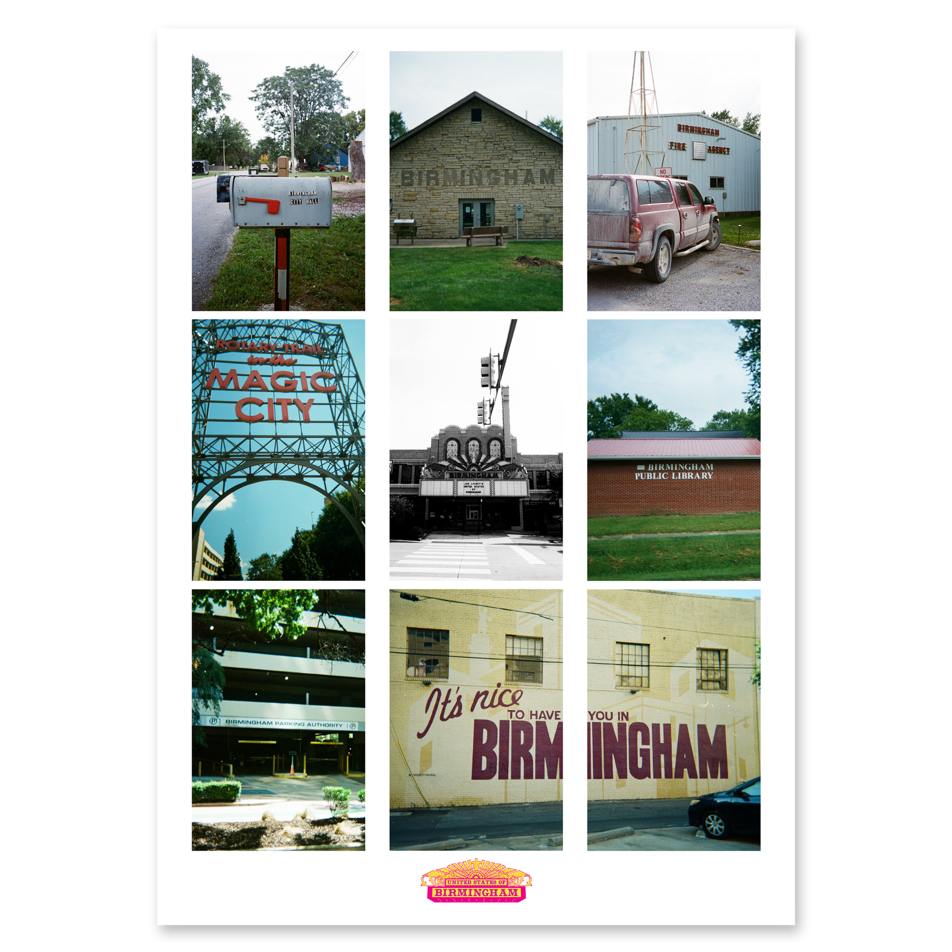 To celebrate the International Day of Birmingham 2025 and the launch of a new photography exhibition, here's a print featuring a selection of 35mm film photos from various Birminghams, captured during the making of Joe Lycett's United States of Birmingham TV show.